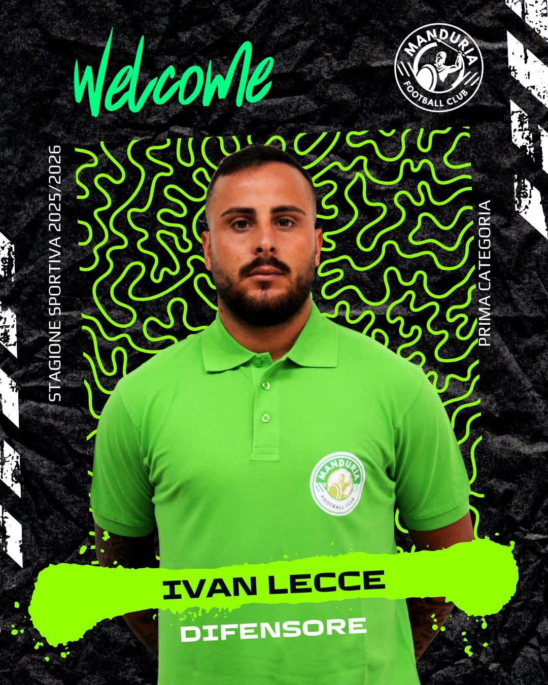 Ivan Lecce è un nuovo calciatore del Football Club Manduria. Il difensore tarantino, classe 1997, arricchisce la flotta dei difensori della nostra squadra. Il calciatore proviene dal Calcio Ceglie e presenta un notevole bagaglio di esperienza avendo già giocato dalla serie d in giù con le maglie del Taranto, Matelica, Cerignola, Grottaglie, Talsano, Manfredonia e Castellaneta.