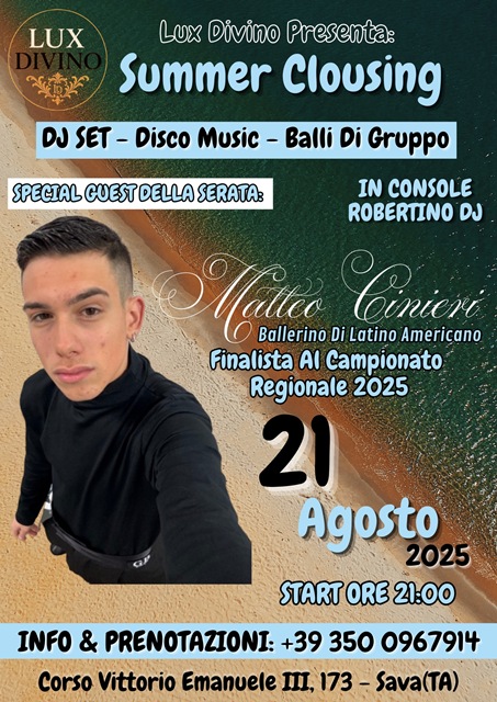 Il Lux Divino di Sava propone per questa sera (giovedì), alle ore 21, a un’indimenticabile Summer Closing, una serata esplosiva tra musica, balli e divertimento senza fine.