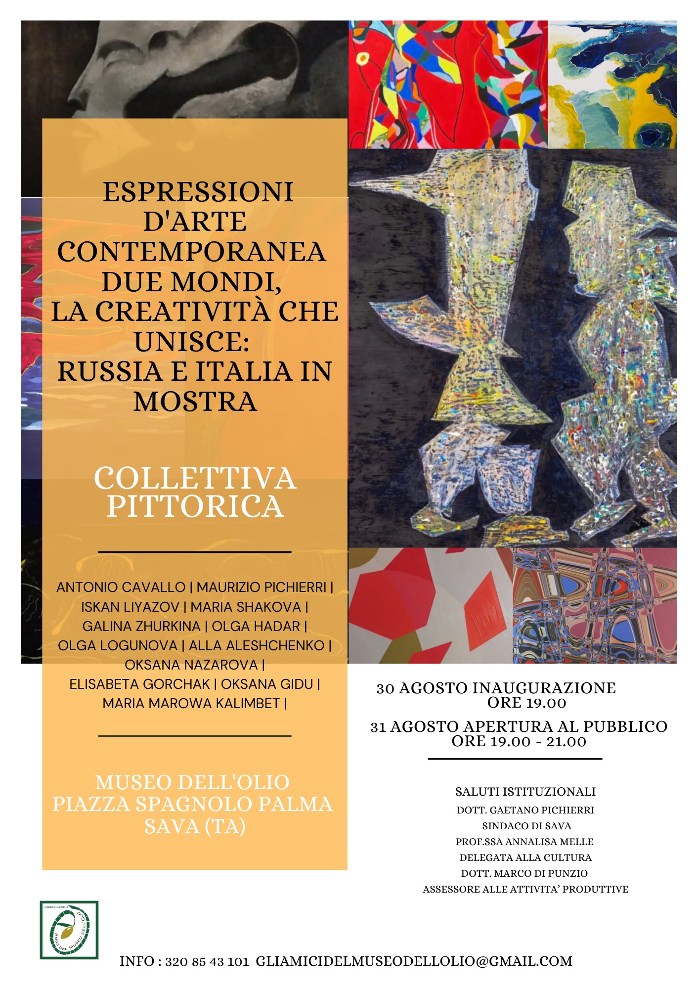 Sabato 30 agosto, alle ore 19, il Museo dell’Olio di Sava ospiterà l’inaugurazione della mostra pittorica collettiva ‘Espressioni d’Arte Contemporanea – Due Mondi, la Creatività che Unisce: Russia e Italia in Mostra’, un evento che celebra l’incontro tra due culture differenti attraverso il linguaggio universale dell’arte.