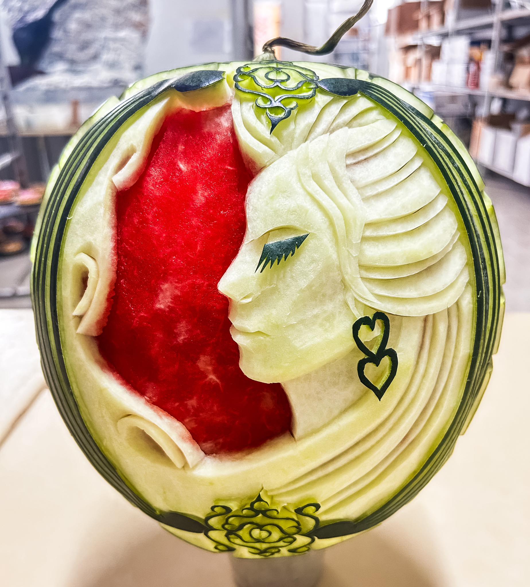 Giuseppe ha trasformato un’anguria in un’opera spettacolare: con le sue mani esperte, incide volti.