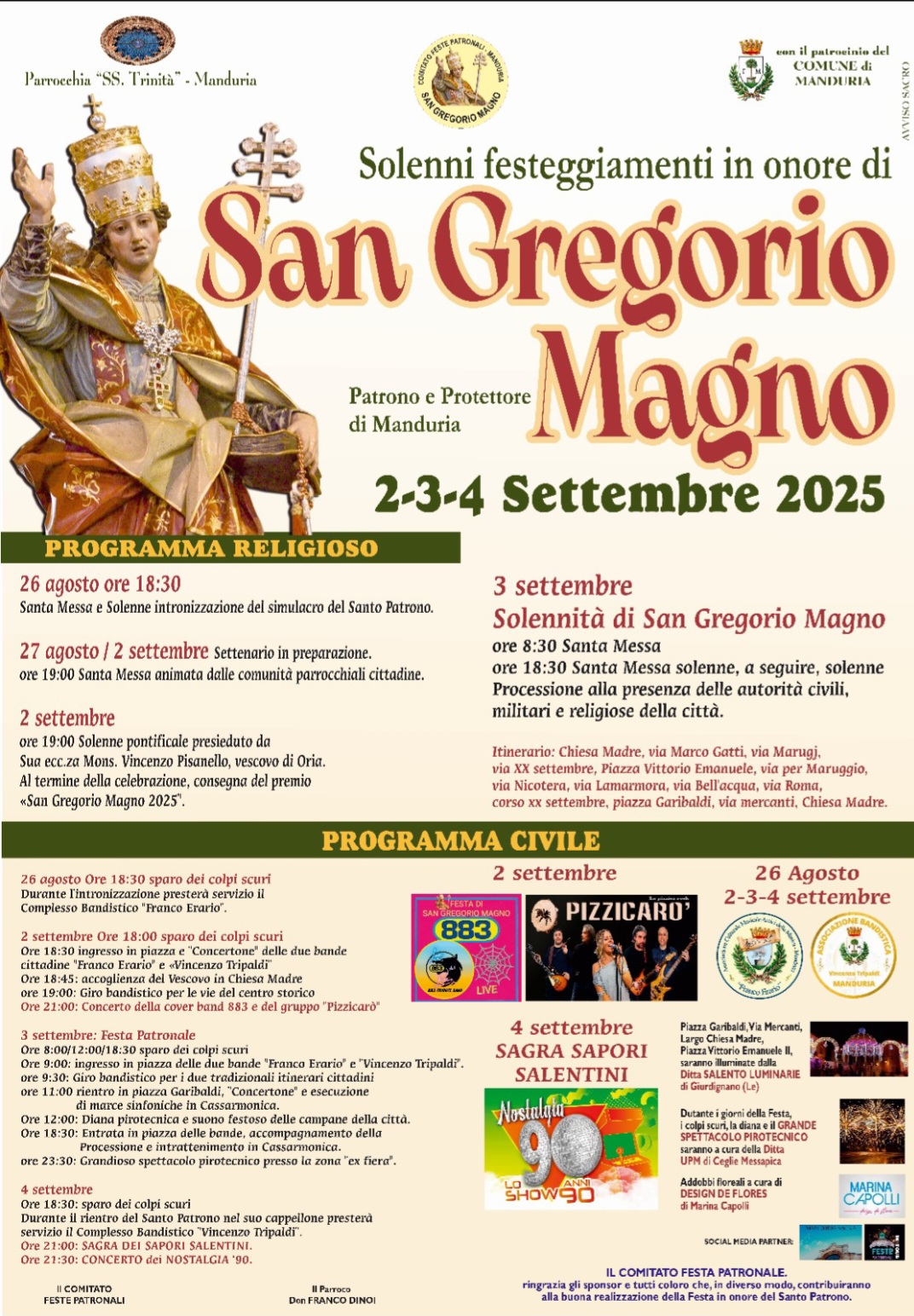 Martedì 26 agosto: ore 18.30, il gruppo bandistico “Franco Erario” si esibirà nei pressi del sagrato della chiesa S.S. Trinità per gli onori al santo protettore San Gregorio Magno; vi sarà l’uscita della statua sul sagrato per il saluto alla città di Manduria. Sempre domani inizierà il settenario.