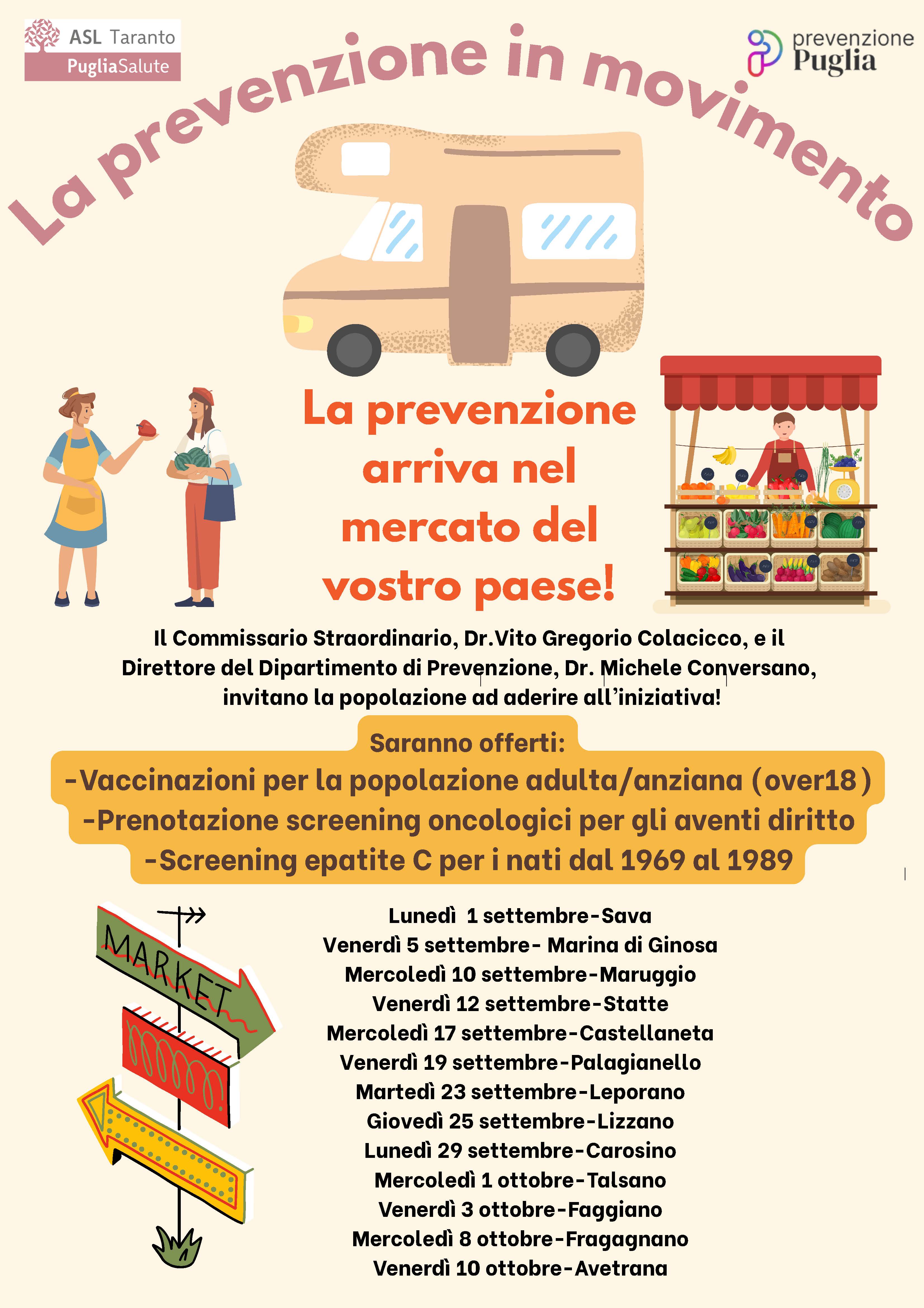 Dopo la pausa estiva, ricomincia “La prevenzione in movimento”: il camper attrezzato della ASL Taranto riprende il suo tour tra i mercati settimanali della provincia di Taranto. Si riparte lunedì 1° settembre al mercato di Sava, venerdì 5 a Marina di Ginosa, mercoledì 10 settembre a Maruggio e venerdì 12 a Statte; mercoledì 17 settembre sarà la volta di Castellaneta, venerdì 19 a Palagianello, martedì 23 settembre a Leporano, giovedì 25 a Lizzano e lunedì 29 a Carosino. Le date di ottobre: mercoledì 1 a Talsano, venerdì 3 ottobre a Faggiano, mercoledì 8 a Fragagnano e venerdì 10 ottobre ad Avetrana.