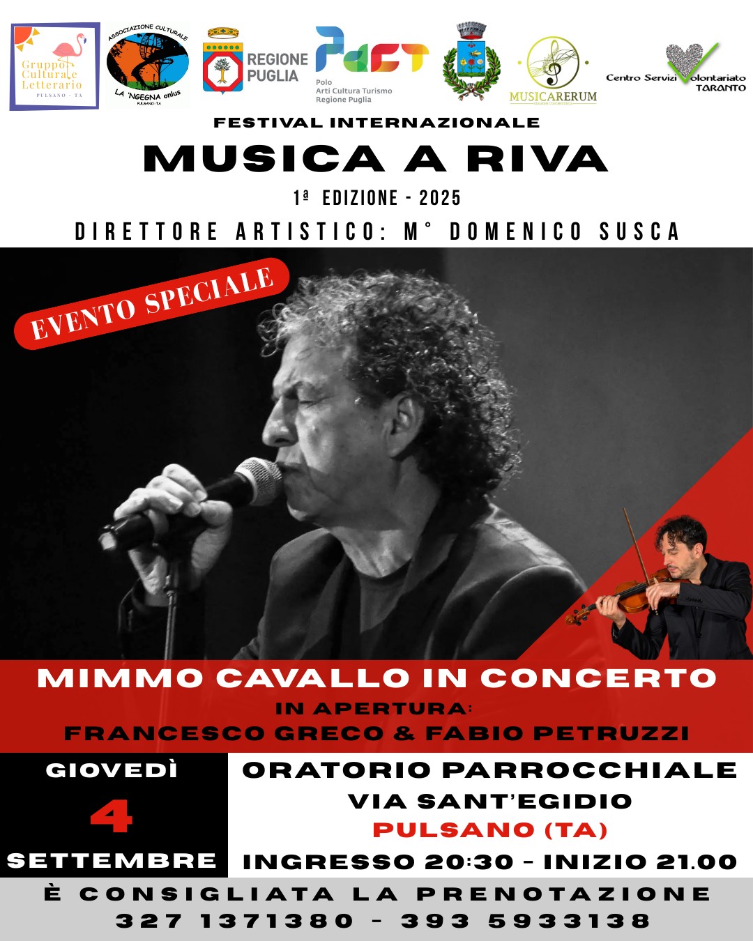 Originario di Lizzano, Mimmo Cavallo è cantautore e compositore di grande profondità poetica. Autore e interprete di album di successo come Siamo meridionali (1980), ha scritto canzoni per artisti del calibro di Mia Martini, Fiorella Mannoia, Zucchero, Ornella Vanoni, Gianni Morandi e Loredana Bertè. Il concerto ripercorrerà l’intero percorso musicale del cantautore, sia come interprete dei suoi brani più celebri sia come autore di canzoni per altri grandi artisti.