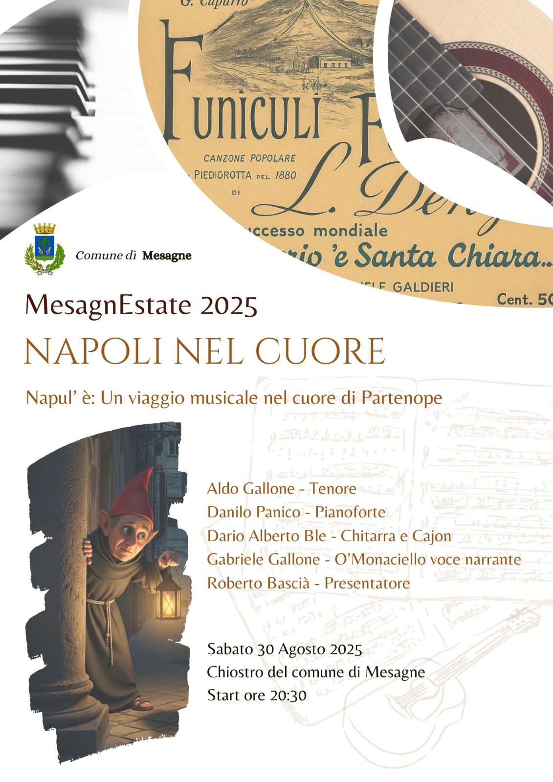 "Napoli nel cuore" è per tutti coloro che amano la grande musica, in particolare per chi ha un legame speciale con Napoli e la sua cultura e per chiunque desideri lasciarsi trasportare da melodie immortali interpretate con profonda passione e professionalità. È un'occasione unica per vivere un momento di autentica bellezza e sentimento, con un'esperienza che arriva dritta al cuore. La serata sarà condotta da Roberto Bascià. L’evento è organizzato dall’Amministrazione comunale nell’ambito del programma “MesagnEstate 2025”.