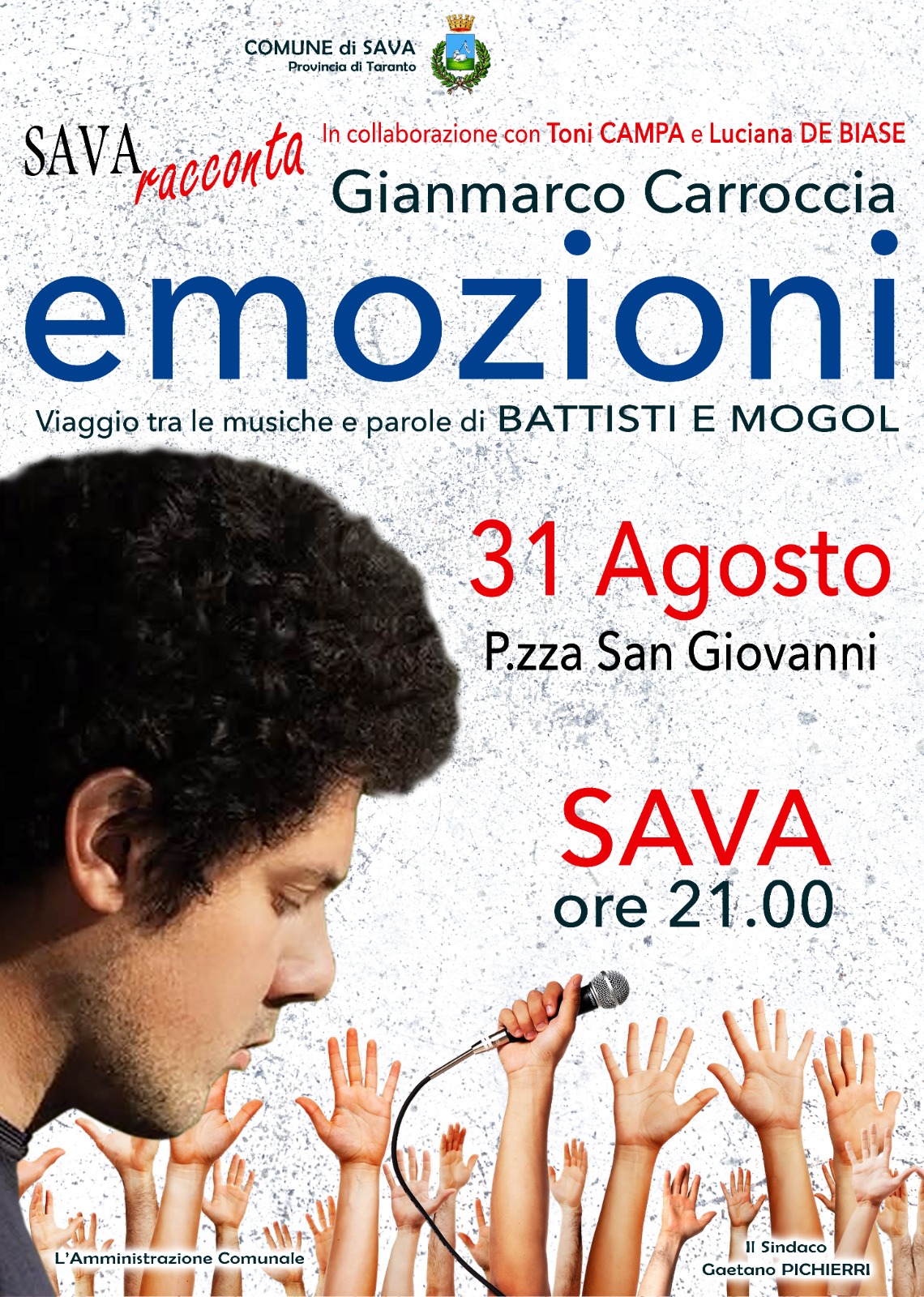 L’estate savese si conclude in grande stile con un evento imperdibile: sabato 31 agosto, alle ore 21, in piazza San Giovanni a Sava, andrà in scena il concerto del cantautore Gianmarco Carroccia, artista apprezzato a livello nazionale per il suo talento e la capacità di emozionare con la sua musica, in particolare nel ricordo del grande Lucio Battisti.