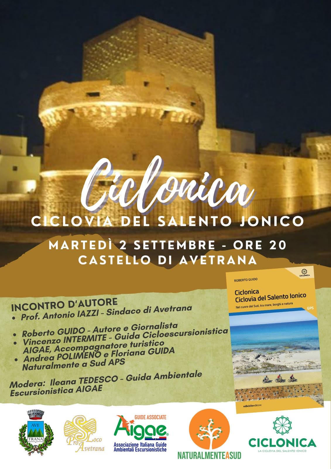 Domani (martedì 2 settembre), alle ore 20, il complesso fortilizio di Avetrana ospiterà la presentazione del libro “Ciclonica - La ciclovia del Salento”, con la presenza dell'autore Roberto Guido, pugliese DOC, è giornalista di professione e cicloesploratore per passione. Cronista al Quotidiano di Lecce, Brindisi e Taranto dal 1979 al 1998, nel 2000 ha fondato e diretto fino al 2017 quiSalento. È uno degli animatori del Coordinamento dal Basso per la Ciclovia dell’Acquedotto Pugliese ed è fra i principali attivisti del movimento di cittadinanza attiva LeccePedala.