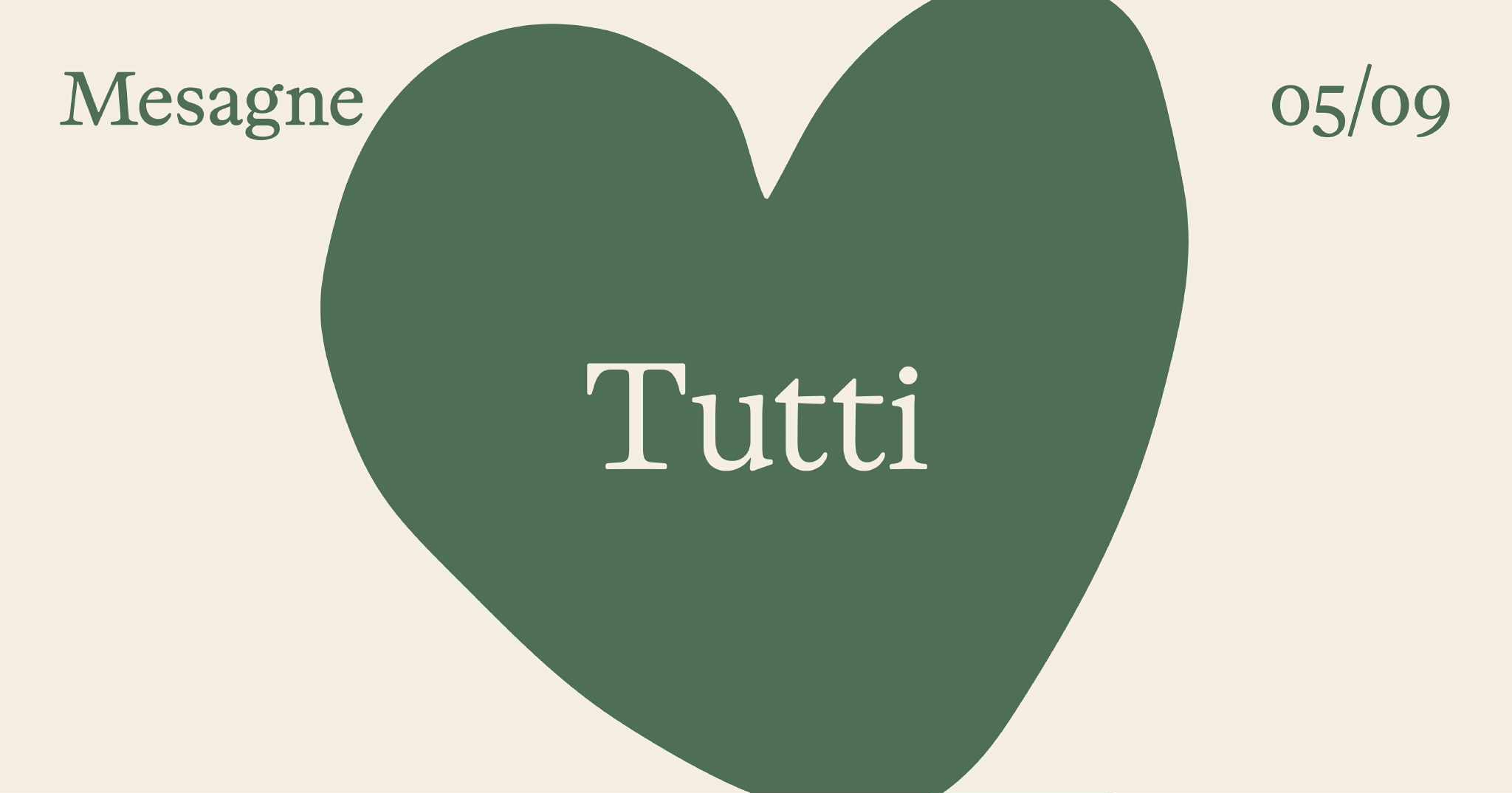 “Tutti” è dedicata a Mesagne e al suo grande cuore, un cuore convertito in immagine e suono da due arpe contrapposte, che, a guardarle bene, sembrano anche due ali. E alle arpe si uniranno altri suoni, altre voci, fino a diventare una grande orchestra popolare, l’Orchestra di Tutti. E la grande Orchestra di Tutti eseguirà la nuova colonna sonora della città.