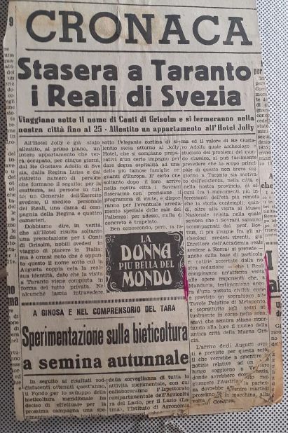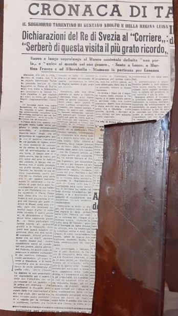 Nella pagina del ‘Corriere del Giorno’ del 21 ottobre relativa alla ‘Cronaca di Taranto’ si legge «All’Hotel Jolly è già stato allestito, al primo piano, un intero appartamento che verrà occupato, per cinque giorni, dal Re Gustavo Adolfo di Svezia, dalla Regina Luisa e dal ristretto numero di persone che formano il seguito: per l’esattezza, sei persone in tutto: un Generale dell’Esercito svedese, il medico personale dei Reali, una dama di compagnia della Regina e quattro camerieri». Essendo in forma strettamente privata, i reali viaggiavano sotto il nome di Conti di Grisolm, per un viaggio di piacere, tuttavia «Ben conoscendo la fama ed il valore di Re Gustavo Adolfo quale archeologo e studioso dei problemi del mondo classico» era più che prevedibile una sua ‘incursione’ nei siti più interessanti; quindi «oltre alla visita al Museo Nazionale (…) si prevede (…) che i Reali compiranno un’attenta visita alle opere imponenti che, a Manduria, testimoniano ancora d’una passata civiltà (…)».