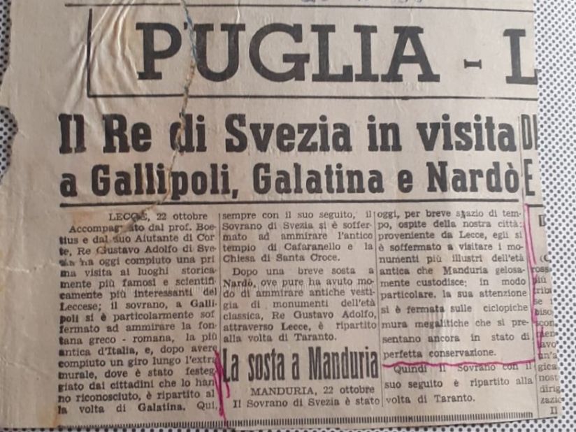 Il giorno seguente, 22 ottobre, Re Gustavo Adolfo, accompagnato dal prof. Boetius (insigne archeologo svedese, già Direttore dell’Accademia reale svedese a Roma), è in visita a Gallipoli, a Galatina, a Nardò — come riportato dalla pagina locale di Lecce del ‘Corriere del Giorno’ del 23 ottobre 1955 —. Ed ecco, nel suo viaggio di ritorno a Taranto), una significativa sosta nell’archeologica e culturalmente frizzante Manduria: «proveniente da Lecce, egli si è soffermato a visitare i monumenti più illustri dell’età antica che Manduria custodisce: in modo particolare, la sua attenzione si è fermata sulle ciclopiche mura megalitiche che si presentano ancora in stato di perfetta conservazione».