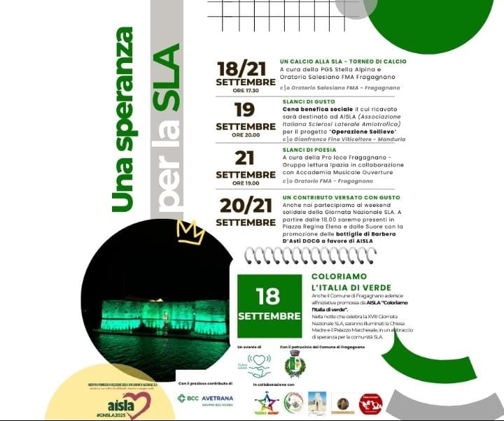 In occasione della Settimana Nazionale sulla SLA, il Comune di Fragagnano aderisce alla campagna nazionale “Coloriamo l’Italia di verde”, promossa da AISLA – Associazione Italiana Sclerosi Laterale Amiotrofica,con il sostegno di ANCI(Associazione Nazionale Comuni d'Italia) per sensibilizzare l’opinione pubblica sulla SLA (Sclerosi Laterale Amiotrofica) e sostenere concretamente chi ogni giorno affronta questa malattia rara e complessa.