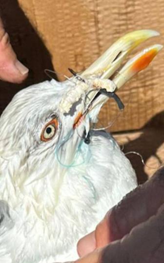 Un gabbiano reale con due ami conficcati nel becco e una lenza attorcigliata intorno al corpo.