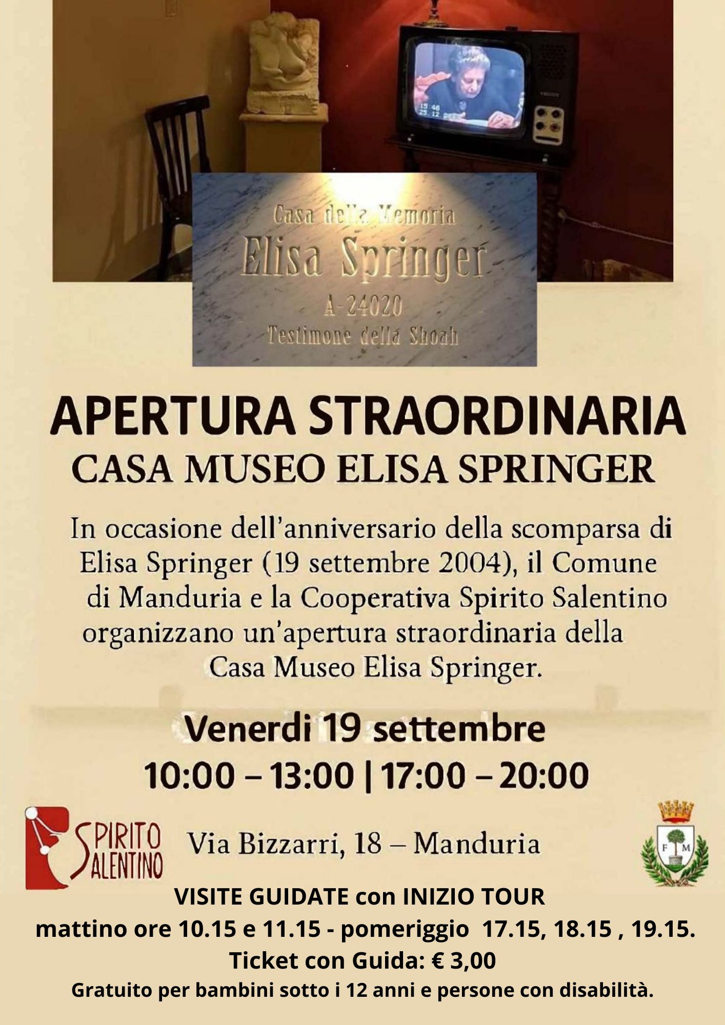 In occasione dell’anniversario della scomparsa di Elisa Springer, il 19 settembre il Comune di Manduria e la cooperativa Spirito Salentino organizzano un’apertura straordinaria della casa museo a lei dedicata.