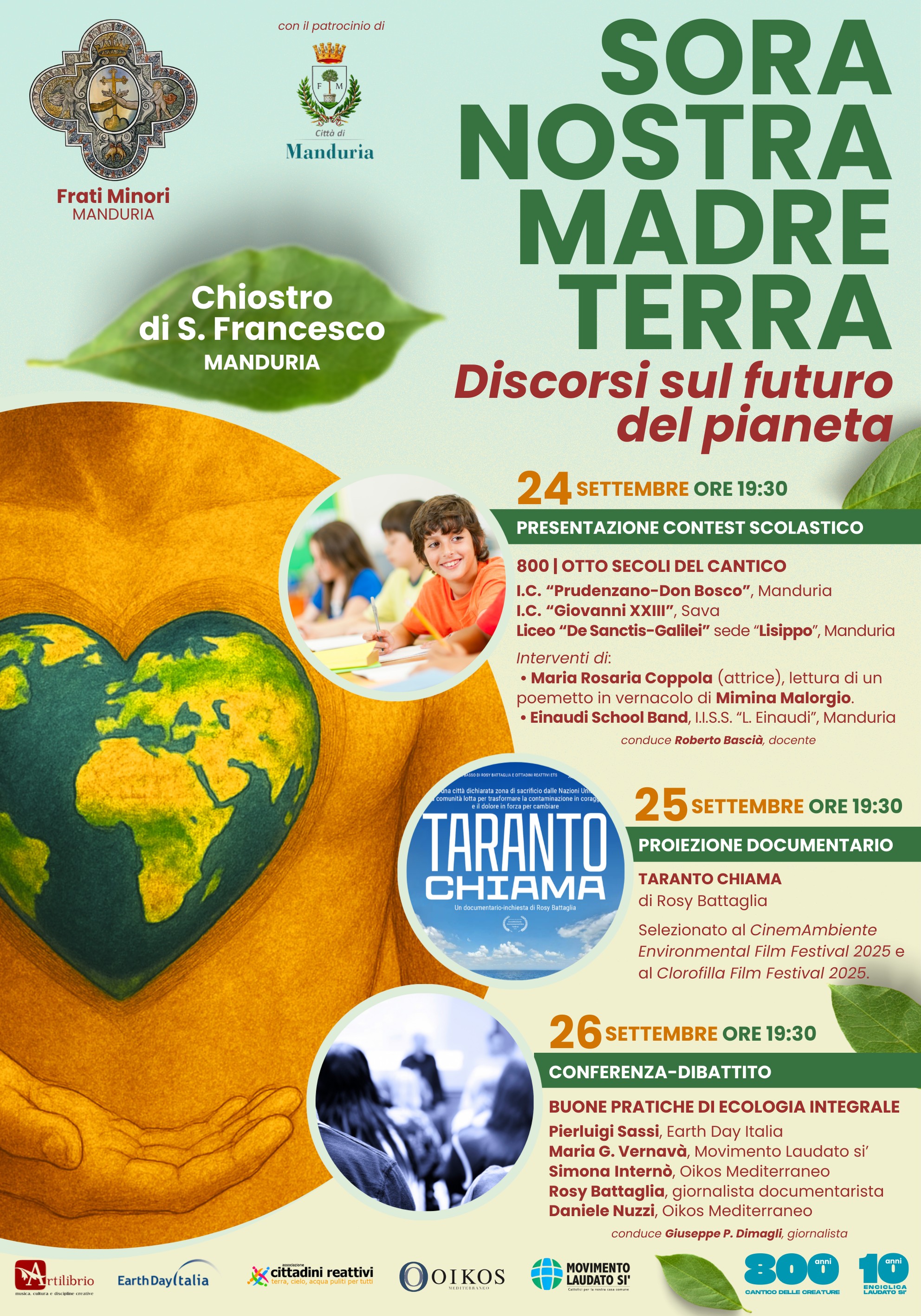 Tre serate di discorsi sul futuro del pianeta, con uno sguardo interessato al territorio. Per celebrare gli ottocento anni del Cantico delle Creature di San Francesco d’Assisi e il decennale dell’enciclica Laudato si’ di Papa Francesco, dal 24 al 26 settembre i Frati Minori di Manduria danno appuntamento a Sora nostra madre Terra, manifestazione culturale organizzata dagli stessi religiosi e concepita in più momenti.