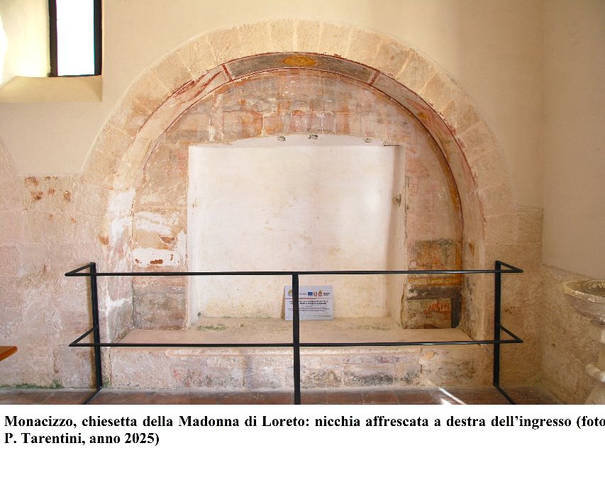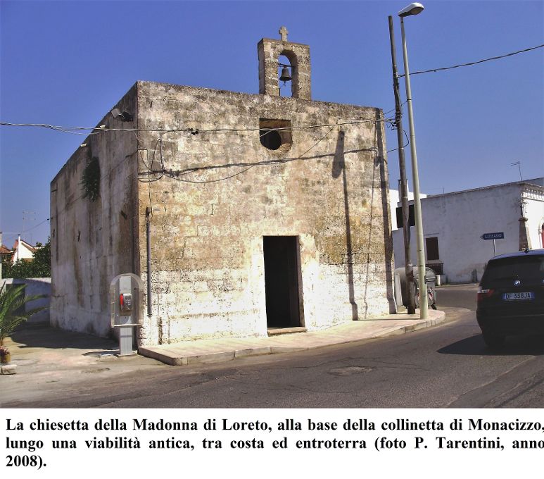Rappresenta, tale chiesetta, un piccolo edificio ricco di fede e di storia, non certo appariscente da un punto di vista architettonico, così descritto in anni non lontani: “La volta è a botte ed è del tutto disadorna. La cornice interna, con ovuli di tipo classico, ed i paramenti la fanno attribuire all’800. Coperta da ripetuti strati di calce bianca e colorata, non presenta alcun segno artistico. Si deve considerare solo come espressione di devozione popolare, costruita in quel punto per ricordare “l’apparizione” della Madonna di Loreto che avrebbe fermato i Turchi, impedendo loro di raggiungere e saccheggiare la parte alta di Monacizzo dov’era ubicata la chiesa dei cristiani” (da M. PICHIERRI - P. FRANZOSO, Torricella, da borgata a comune, Manduria, Barbieri, 1999, p. 186).