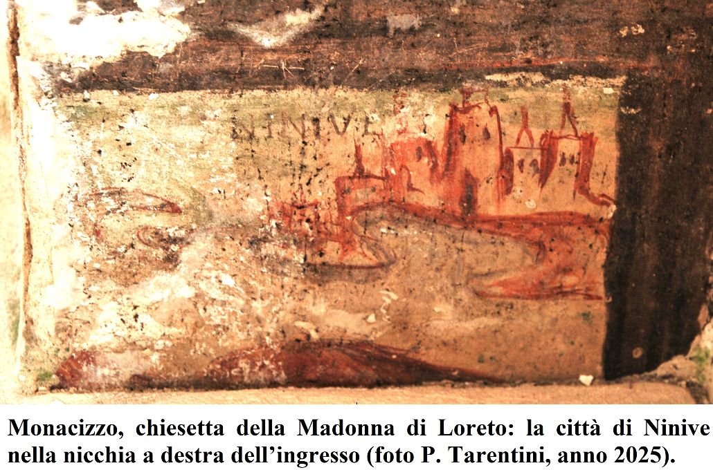 In una grande nicchia arcuata sulla parete a destra dell’ingresso si osserva un ampio affresco, purtroppo danneggiato da una nicchia quadrangolare aperta, ovviamente in epoca successiva, nella parete di fondo; in tale affresco si riesce appena ad intravedere il volto di una Madonna in posizione centrale; in basso, nell’angolo di sinistra, è riprodotta l’insenatura prospiciente un impianto urbano con torri e fortificazioni che, una scrittura dipinta a lato, attribuisce alla città di Ninive. Ninive, come è noto, è la grande ed antica capitale assira documentata da importanti resti archeologici (in parte devastati dai miliziani dell’Isis nel 2015), ubicata nel Nord dell’Iraq, sulla riva sinistra del Tigri, di fronte all’attuale Mosul. Distrutta nel 612 a.C., dopo un lungo periodo di straordinario splendore monumentale ed architettonico, è considerata nella Bibbia come città peccaminosa, malvagia, crudele e guerrafondaia, destinata, quindi, alla punizione divina. E’impossibile, nelle condizioni lacunose dell’affresco, coglier un collegamento tra la città ed il resto della raffigurazione. Sempre in questa nicchia, altre immagini si osservano nella parte interna dell’arco, tra cui un disco (solare?) giallastro, centrale, in alto, ed una figura femminile laterale in discreto stato di conservazione.