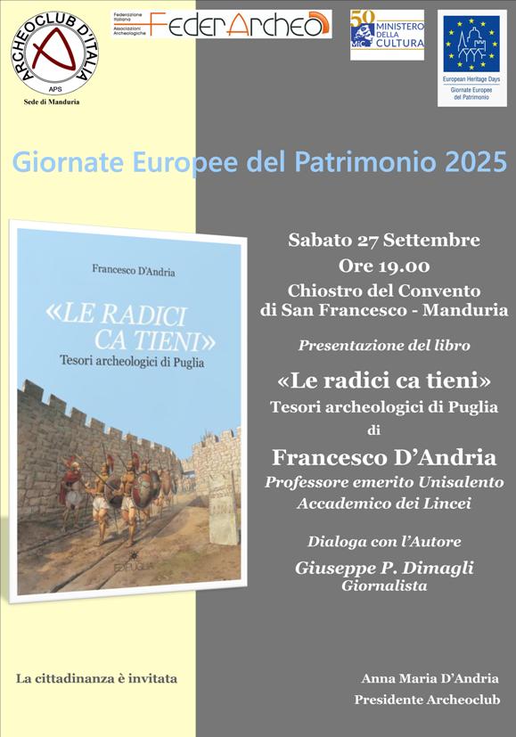 Il secondo, sabato 27 settembre, alle ore 19, avrà come cornice il chiostro del convento di San Francesco. Inserito nelle vaste celebrazioni delle Giornate Europee del Patrimonio, a cui Archeoclub partecipa da anni, che si prefiggono di sensibilizzare i cittadini alla valorizzazione del proprio patrimonio culturale materiale ed immateriale, è la presentazione del libro:“Le radici ca tieni” di Francesco D’Andria, archeologo, professore emerito dell’Unisalento ed accademico dei Lincei. Dialogherà con l’autore il giornalista nostro concittadino Giuseppe P. Dimagli.