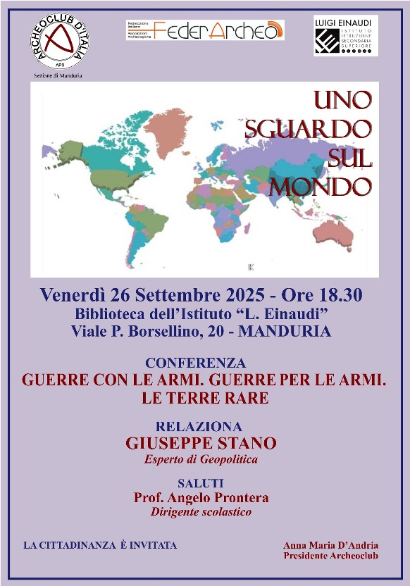 «Il primo, venerdì 26 settembre, alle ore 18,30, presso la biblioteca dell’istituto “L.Einaudi”, è di fatto il terzo appuntamento della rassegna che Archeoclub destina ai problemi di politica internazionale, dal titolo “Uno sguardo sul mondo” e si avvale della competenza del concittadino Giuseppe Stano, acquisita nella sua lunga carriera di funzionario NATO» è riportato in un comunicato di Archeoclub. «Indubbiamente, è uno sguardo particolarmente preoccupato che vede una narrazione bellicista occupare sempre più gli spazi del dibattito pubblico e risulta più che mai difficile comprendere torti e ragioni, cause e conseguenze. Tuttavia, un elemento di analisi pare incontrovertibile: un fattore determinante negli equilibri di potere e di forza è l’accaparramento delle risorse della Terra necessarie a perpetuare il nostro stile di vita.