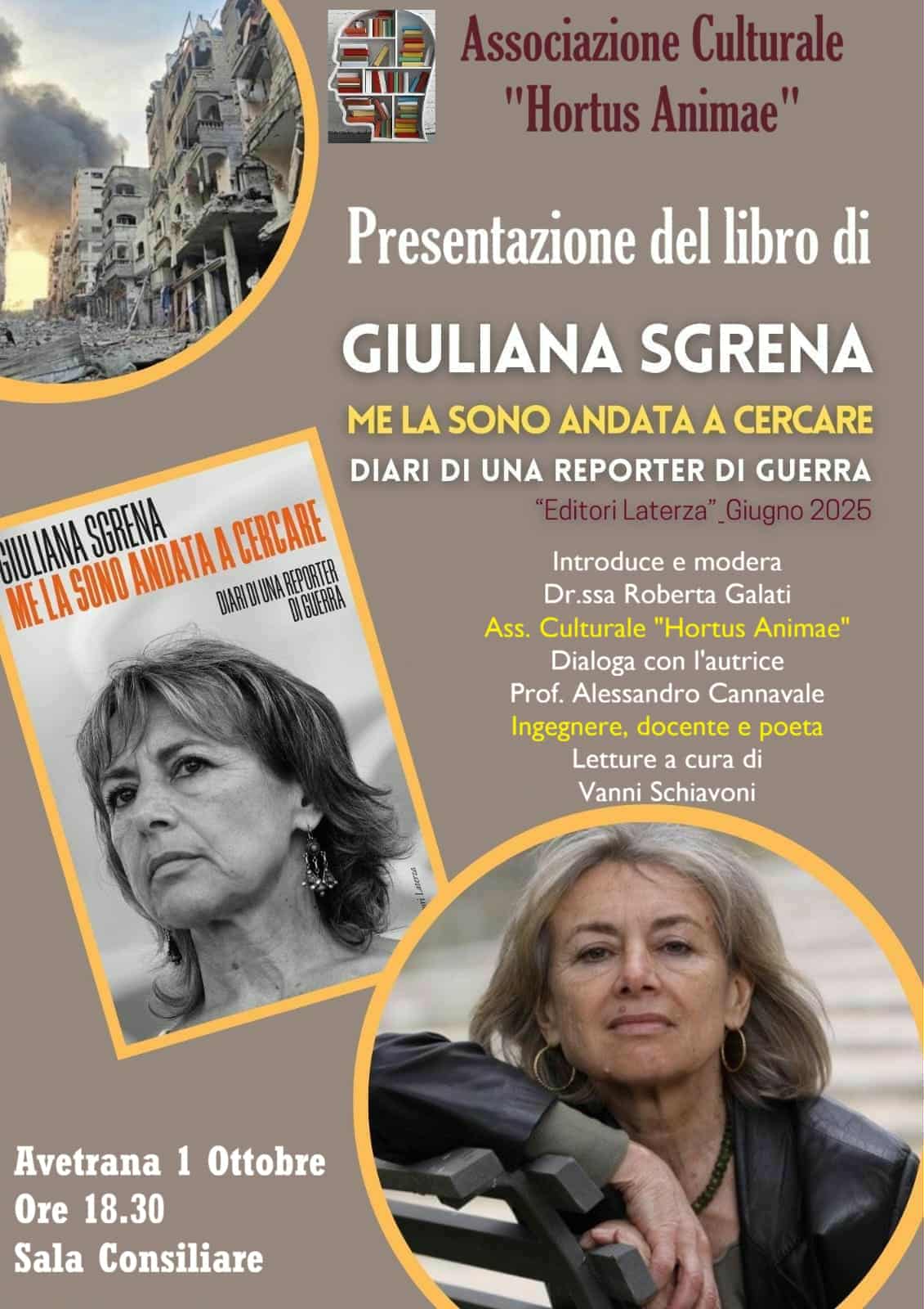 Nella sala consiliare del Comune di Avetrana, questa sera (mercoledì 1° ottobre), alle ore 18:30, si terrà la presentazione dell’ultimo libro di Giuliana Sgrena “Me la sono andata a cercare. Diari di una reporter di guerra”, pubblicato da Laterza, promosso dall’associazione “Hortus Animae” con il patrocinio del Comune di Avetrana.