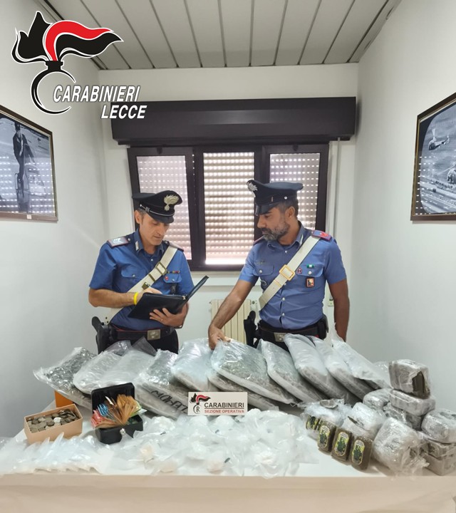 A Taviano, in casa di un 50enne, i Carabinieri hanno trovato nascosti in due borsoni, occultati vicino al muro di cinta esterno dell’abitazione, 11 chili di sostanza verosimilmente stupefacente del tipo marijuana, 7 chili di hashish e quasi un chilo di cocaina.