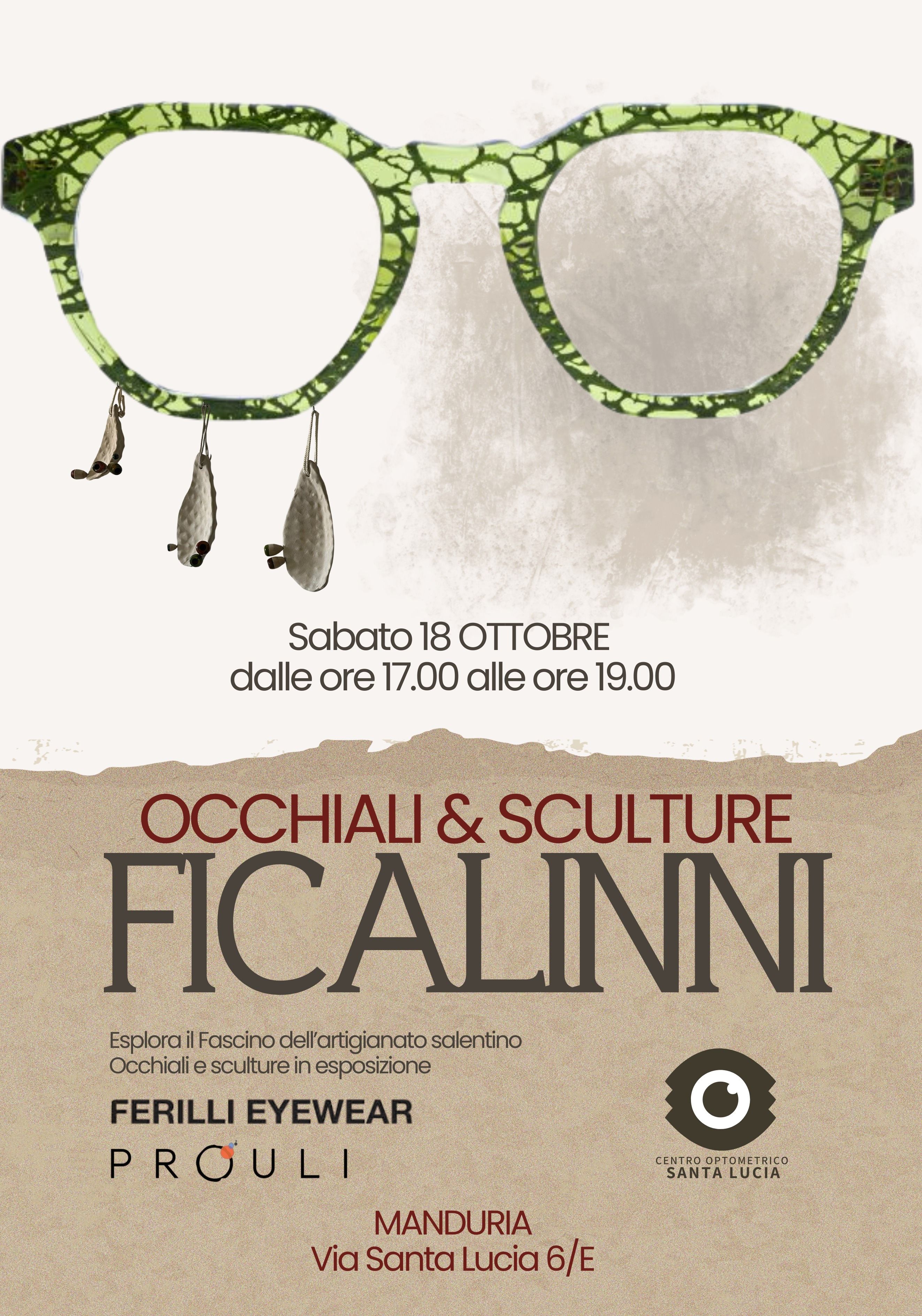 Un incontro tra arte, artigianato e innovazione è in programma a Manduria il prossimo sabato 18 ottobre, dalle ore 17 alle 19, presso il “Centro Optometrico Santa Lucia” (via Santa Lucia 6/E). L’evento, dal titolo “Occhiali & Sculture – Ficalinni”, propone una mostra istantanea che celebra l’eccellenza del design salentino e l’unicità dei materiali naturali.