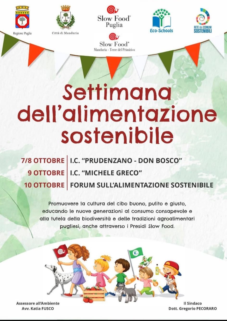 Da domani 7 sino al 10 ottobre, gli studenti di tutti gli istituti comprensivi di Manduria parteciperanno alla Settimana dell’Alimentazione Sostenibile. L’iniziativa, organizzata dall’Amministrazione comunale – assessorato Ecologia e Ambiente, con la collaborazione di Slow Food Puglia e il patrocinio della Regione Puglia, è rivolta a tutte le scuole della città per educare le nuove generazioni ad una maggiore consapevolezza alimentare. Un vero e proprio percorso educativo e sensoriale che mette al centro la sostenibilità alimentare, uno degli obiettivi dell’Agenda ONU 2030.