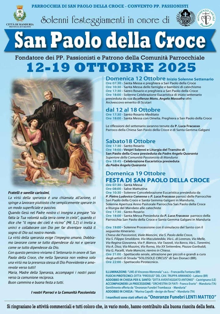 Ore 10,30: Solenne concelebrazione Eucaristica presieduta da padre Pietro Conenna e da padre Luca Fracasso, parroci delle parrocchie San Paolo della Croce e Santa Gemma Galgani di Manduria.
