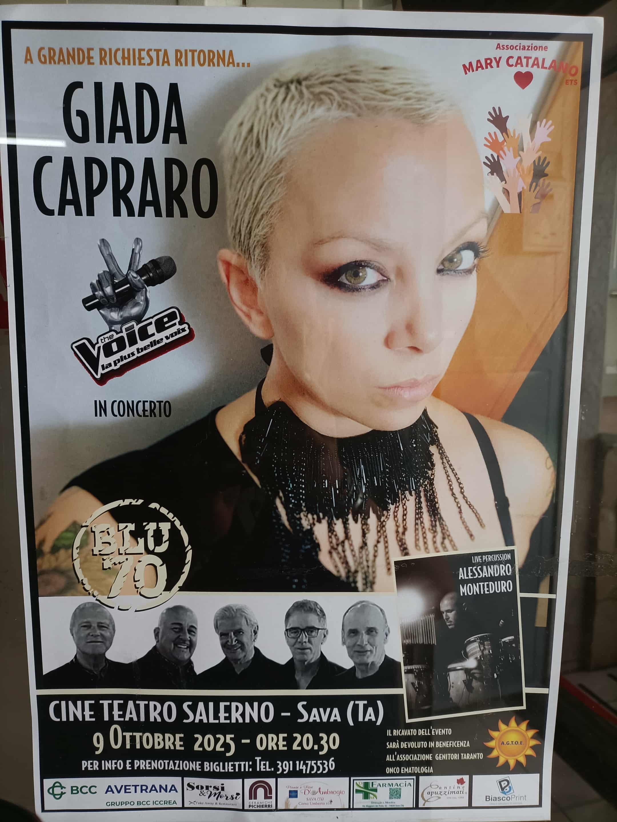 Il 9 ottobre, a grande richiesta, Giada Capraro ritorna. Si esibirà al teatro cinema Salerno di Sava accompagnata dai Blu 70, gruppo storico del Sud Italia da oltre 30 anni in giro per l’Italia. Straordinari artisti con un curriculum di alto profilo, come ad esempio arrivare quarti su oltre quattromila band al famoso concorso di Radio Capital “Capitalent”, oltre a varie partecipazioni in Rai e oltre 100 concerti all’anno. Ospite d’onore, oltre alla meravigliosa Giada, ci sarà un grande percussionista di fama nazionale ed internazionale, percussionista dell’orchestra della Notte della Taranta nonchè del Festival di Sanremo: Alessandro Monteduro, altro nostro artista salentino doc.