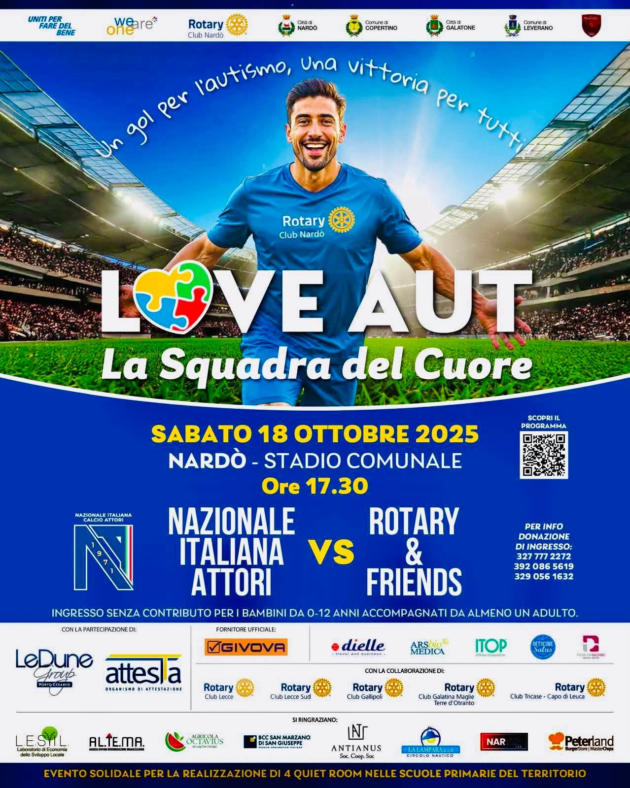 Sabato 18 ottobre, alle ore 17:30, presso lo stadio comunale di Nardò “Giovanni Paolo II” si svolgerà l’evento “Love Aut”, dedicato al disturbo dello spettro autistico: una partita solidale che vedrà scendere in campo la Nazionale Calcio Attori e la squadra Rotary and Friends.