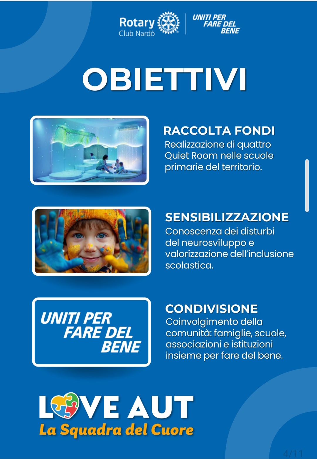 L’iniziativa, promossa dal Rotary Club Nardò con il patrocinio dei Comuni di Nardò, Copertino, Galatone e Leverano, mira a raccogliere fondi per la realizzazione di quattro “Quiet Room” presso le scuole primarie del territorio: ambienti sicuri e accoglienti che offrono tranquillità e benessere ai bambini. La squadra della Nazionale Calcio Attori vede tra i convocati alcuni volti noti della televisione, quali:Luca Capuano, Stefano Pantano, Enrico Lo Verso, Raffaello Balzo, Domenico Fortunato, Luca Varone, Samuele Carrino, Francesco Cicchella, Franco Oppini, Andrea Arru, Ninetto Davoli, Seydou Sarr, Agostino Penna, Francesco Ferrante, Daniele Perrone, Giuseppe Garibaldi, Simone Borrelli e Fabrizio Romondini.