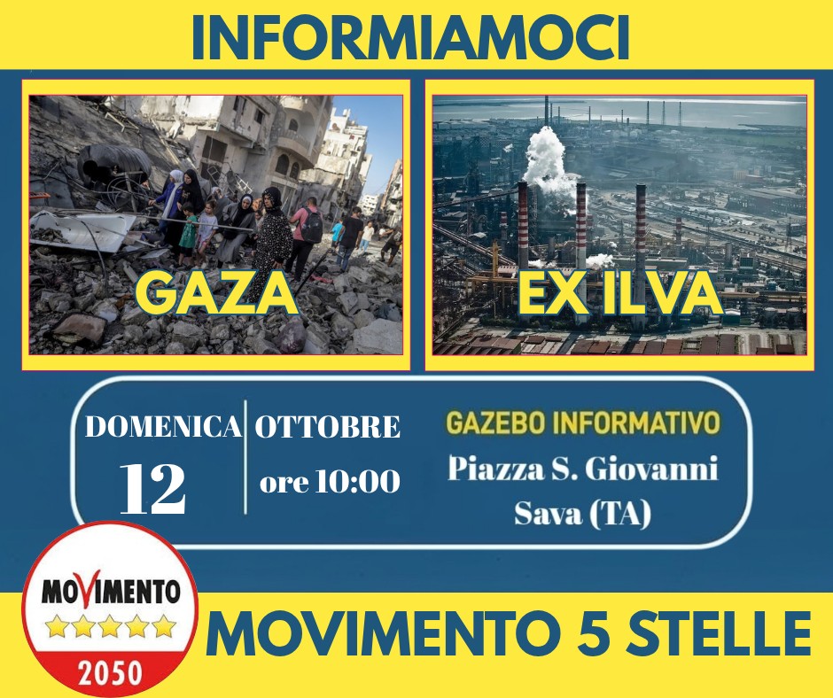 Il Movimento 5 Stelle di Sava allestirà un gazebo informativo domenica 12 ottobre, dalle ore 10, in piazza San Giovanni, per approfondire due temi di grande attualità e rilevanza: la crisi umanitaria a Gaza e la vicenda dell’ex ILVA di Taranto.