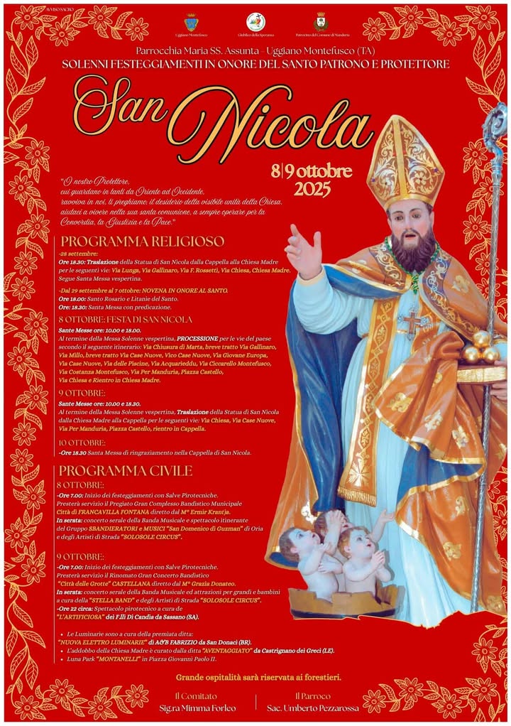 Al termine della Messa solenne vespertina, traslazione della statua di San Nicola dalla chiesa Madre alla cappella per le seguenti vie: via Chiesa, via Case Nuove, via per Manduria, piazza Castello e rientro in cappella.