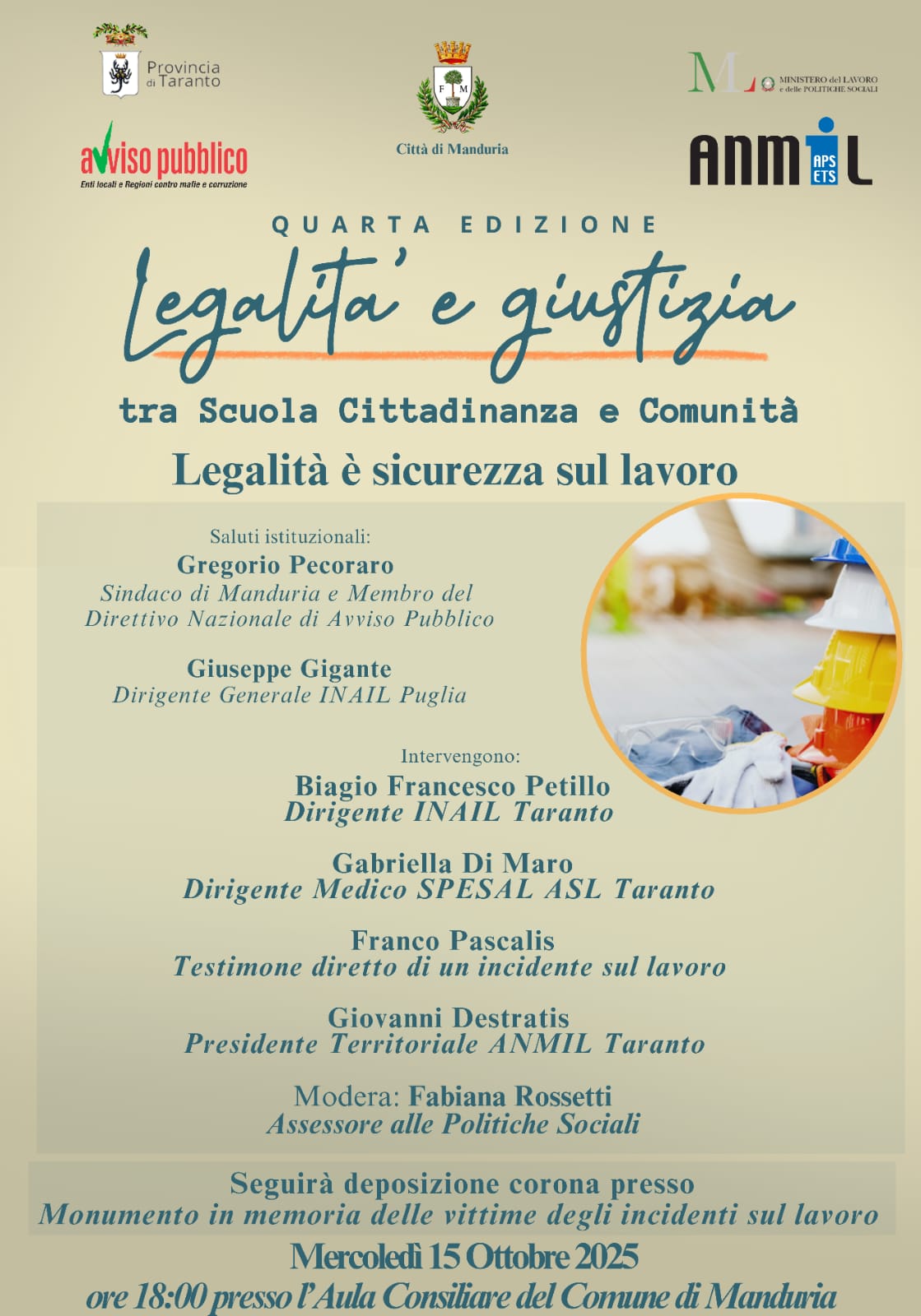 Mercoledì 15 ottobre, alle ore 18, presso il Palazzo di Città, prosegue la rassegna “Legalità e Giustizia - tra Scuola, Cittadinanza e Comunità” con un nuovo appuntamento che avrà per tema “Legalità e sicurezza sul lavoro”. L’ approfondimento, di fondamentale importanza, coinvolge istituzioni, mondo del lavoro, scuola e società civile.