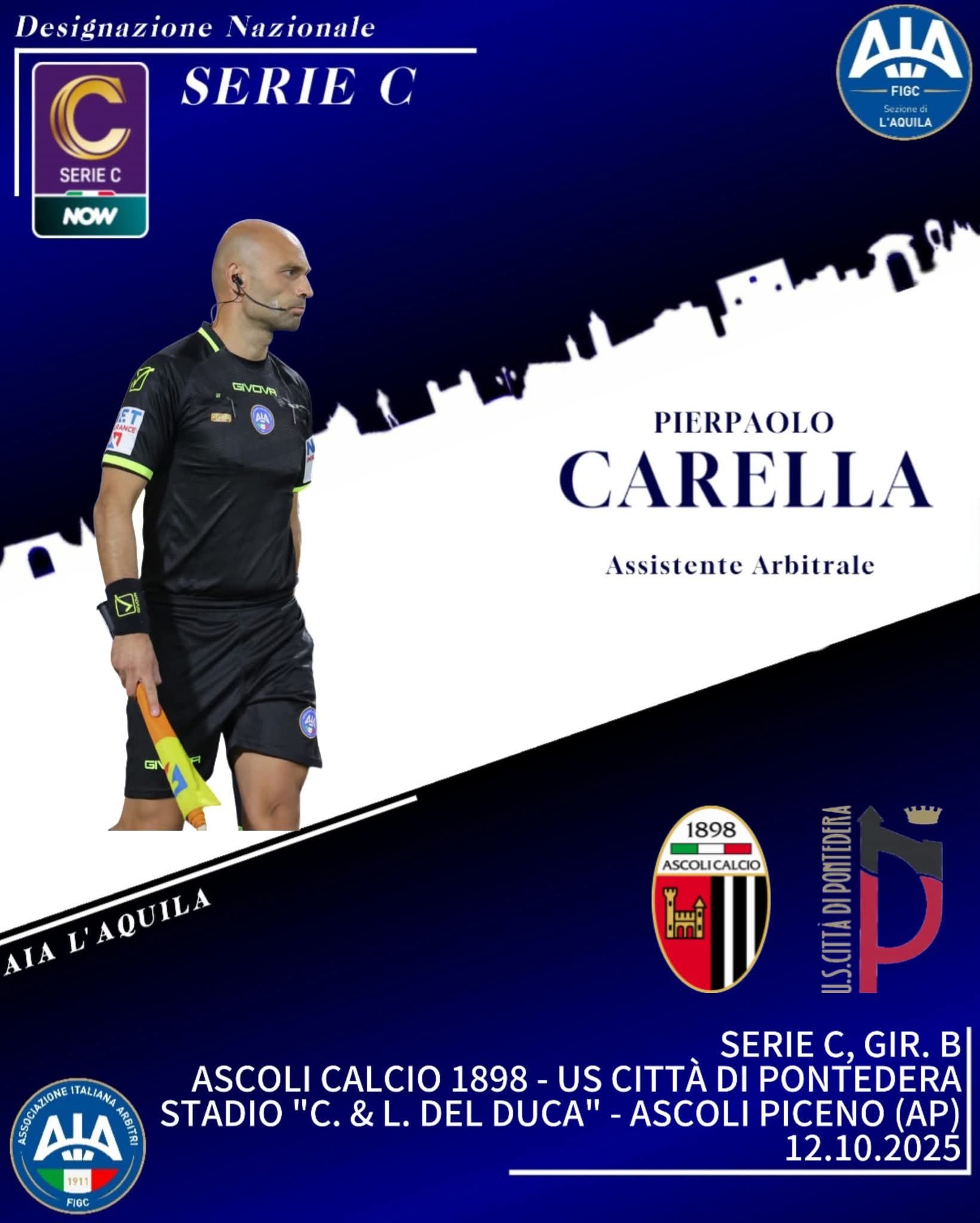 Pierpaolo Carella (AIA L’Aquila) designato come primo assistente per l’incontro fra Ascoli e Pontedera.