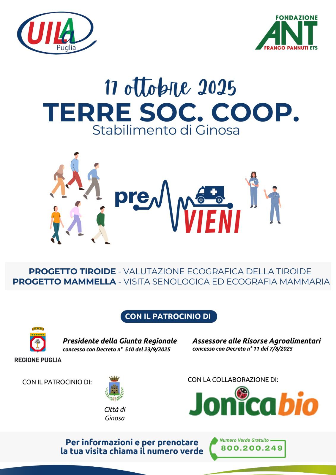 Il 17 ottobre, presso la società cooperativa agricola “Terre” di Ginosa, l’ambulatorio mobile di Fondazione ANT offrirà visite di prevenzione oncologica gratuite nell’ambito della terza edizione di “preVIENI”, il progetto promosso da UILA Puglia per portare la diagnosi precoce nei luoghi di lavoro del comparto agroalimentare. L’iniziativa rientra in un tour regionale che tocca aziende e comunità, con equipe mediche ANT specializzate in screening su melanoma, tiroide, mammella e testicolo, per favorire accesso tempestivo e vicino ai territori.