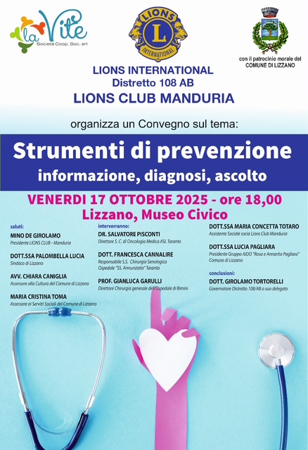 I lavori saranno aperti dai saluti del presidente del Lions Club di Manduria Mino Degirolamo, del sindaco di Lizzano Lucia Palombella, dell’assessore alla Cultura Chiara Caniglia Chiara e dell’assessore ai Servizi Sociali Maria Cristina Toma.