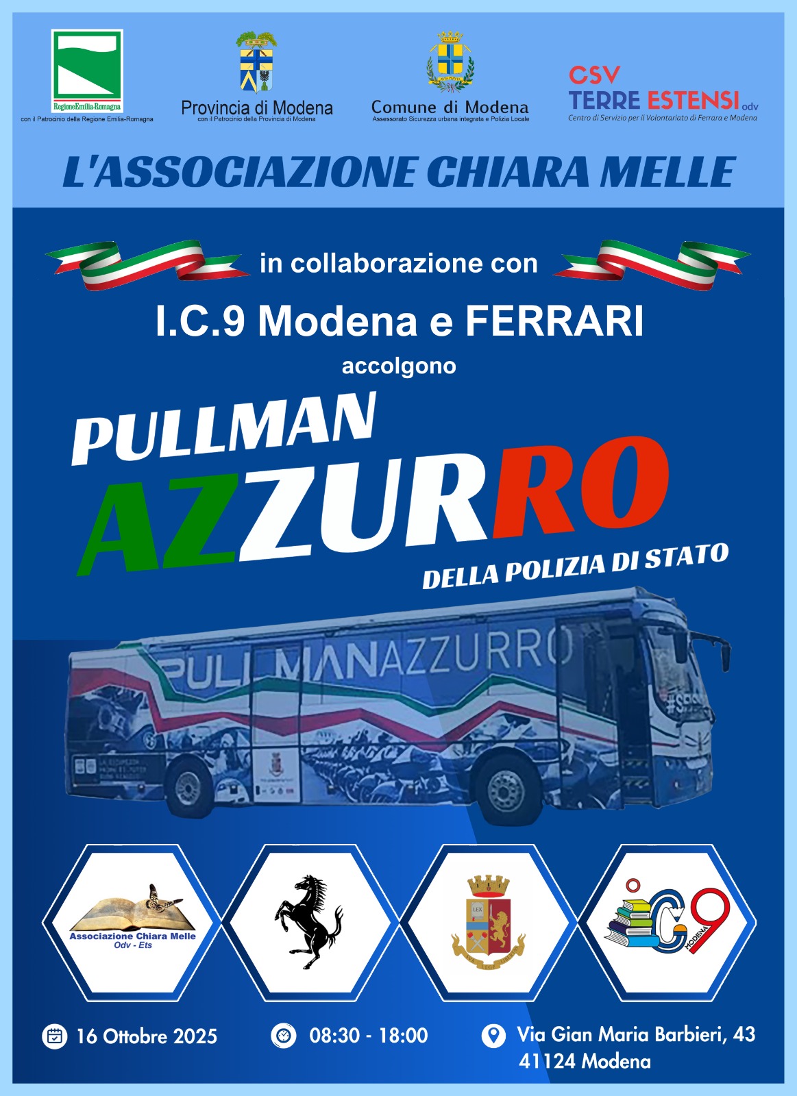 Il 16 ottobre, una giornata speciale, vedrà protagonista l’Istituto Comprensivo 9 di Modena, dove il Pullman Azzurro della Polizia di Stato farà tappa per un evento di grande valore educativo. L'iniziativa, che coinvolgerà docenti, studenti e genitori avrà come tema centrale la sicurezza stradale e l'educazione civica, con l’obiettivo di sensibilizzare i ragazzi sui temi della prevenzione degli incidenti e del rispetto delle regole.