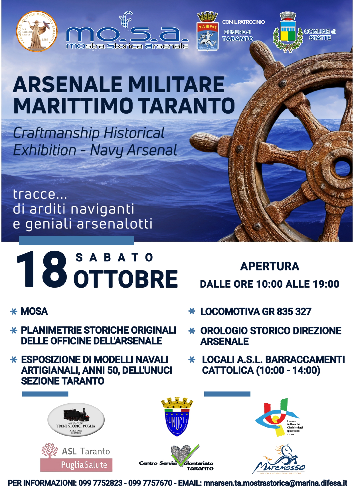 Da diversi anni la Marina Militare e l'Arsenale di Taranto proseguono una virtuosa politica di apertura verso la cittadinanza, rendendo accessibile un luogo che rappresenta parte fondamentale della storia moderna della città. Questa iniziativa si inserisce in questo percorso, favorendo l’accesso a tutti senza alcuna distinzione e confermando il forte legame tra l’Arsenale e il territorio. L’evento prevede l’esposizione di modelli navali storici nel bunker antistante il MO.S.A., la visita guidata al MO.S.A., la presentazione della Locomotiva a Vapore GR 835327 completamente restaurata, visite guidate all’Orologio storico della direzione dell’Arsenale e al Museo Storico dell’Arsenale.