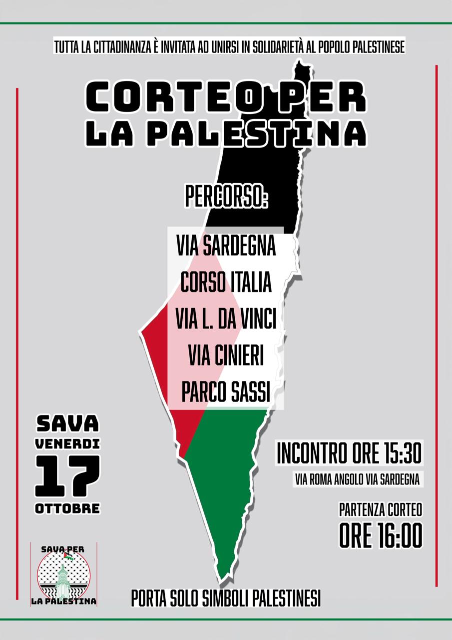In segno di solidarietà con il popolo palestinese e per chiedere con forza la fine della violenza, dell’occupazione e delle continue violazioni dei diritti umani nei territori palestinesi, il comitato “Sava per la Palestina” promuove una manifestazione pubblica che si terrà venerdì 17 ottobre, a partire dalle ore 15.30.