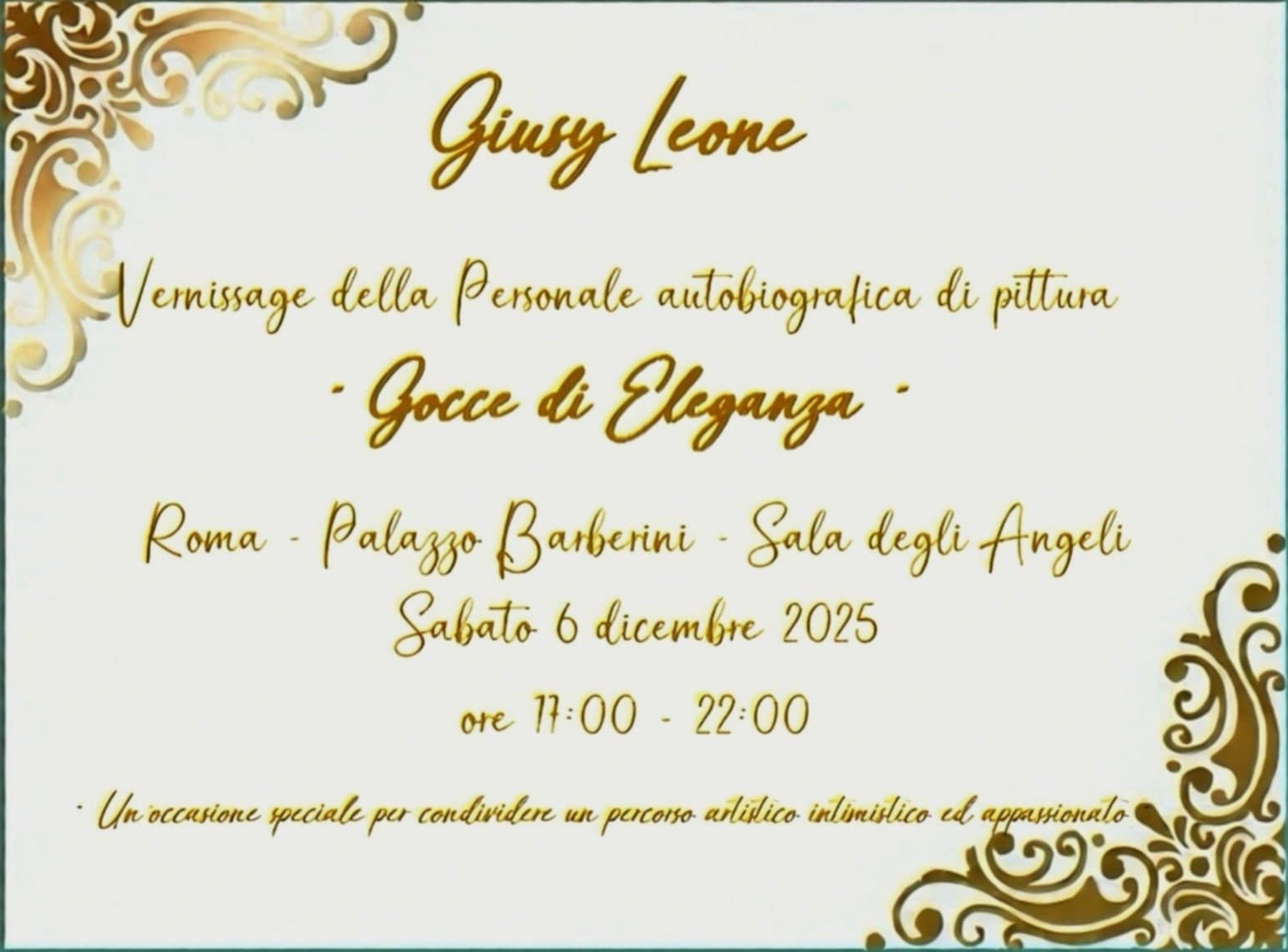 Sarà inaugurata il 6 dicembre, alle ore 11, la personale autobiografica di pittura di Giusy Leone, “Gocce di eleganza”, alla Galleria Nazionale d’Arte d’Antica di palazzo Barberini a Roma.