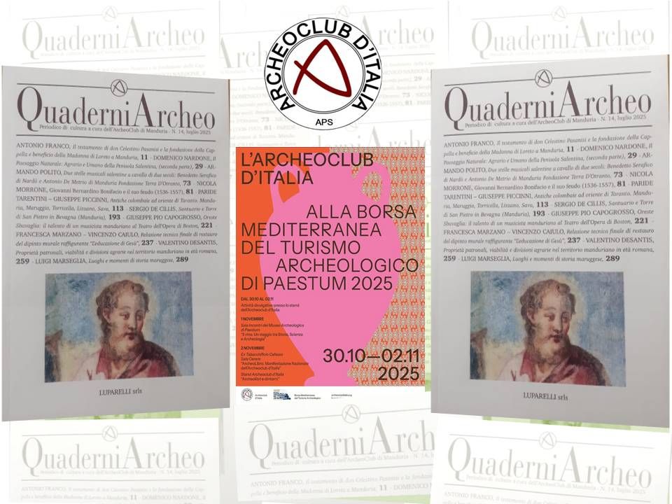 Sarà presentato l’ultimo numero dei QuaderniArcheo, costituito da dieci saggi, quattro dei quali sono stati curati da soci Archeoclub Manduria