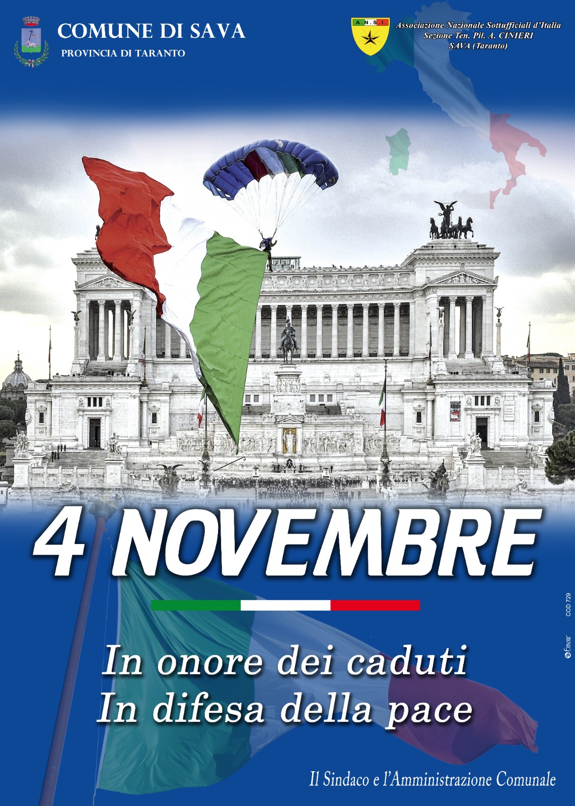 La sezione di Sava dell’Associazione Nazionale Sottufficiali d’Italia, come da consolidata tradizione, anche quest’anno intende organizzare la cerimonia del IV Novembre, giornata dedicata ai Caduti di tutte le Guerre, all’Unità d’Italia e alle Forze Armate.