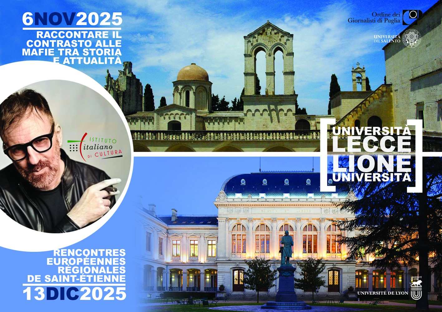 La medesima testimonianza verrà poi ripetuta in un “assolo” presso la prestigiosa università di Lione nell’ambito della terza edizione dei “Rencontres européennes régionales de Saint-Étienne”, serie di incontri dedicati a temi di rilevanza internazionale in cui si presentano agli studenti dell’ateneo francese alcune eminenze nonché importanti testimoni di vari settori: economia, politica, giurisprudenza, arte e, per l’appunto, scrittura. L’evento, che quest’anno verte attorno al problema delle anomalie criminali in Europa, è organizzato con il sostegno dell’Istituto Italiano di Cultura di Lione e si svolgerà a porte aperte presso il Municipio di Saint-Étienne.