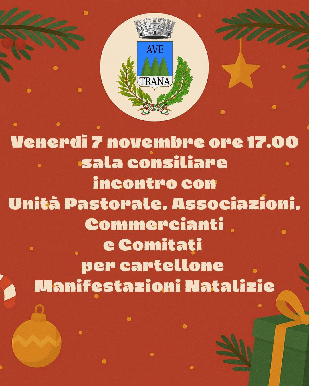 Si svolgerà domani (venerdì 7 novembre), alle ore 17, presso la sala consiliare del Comune di Avetrana l’incontro con Unità Pastorale, associazioni, commercianti e comitati per redigere insieme il cartellone delle manifestazioni natalizie.