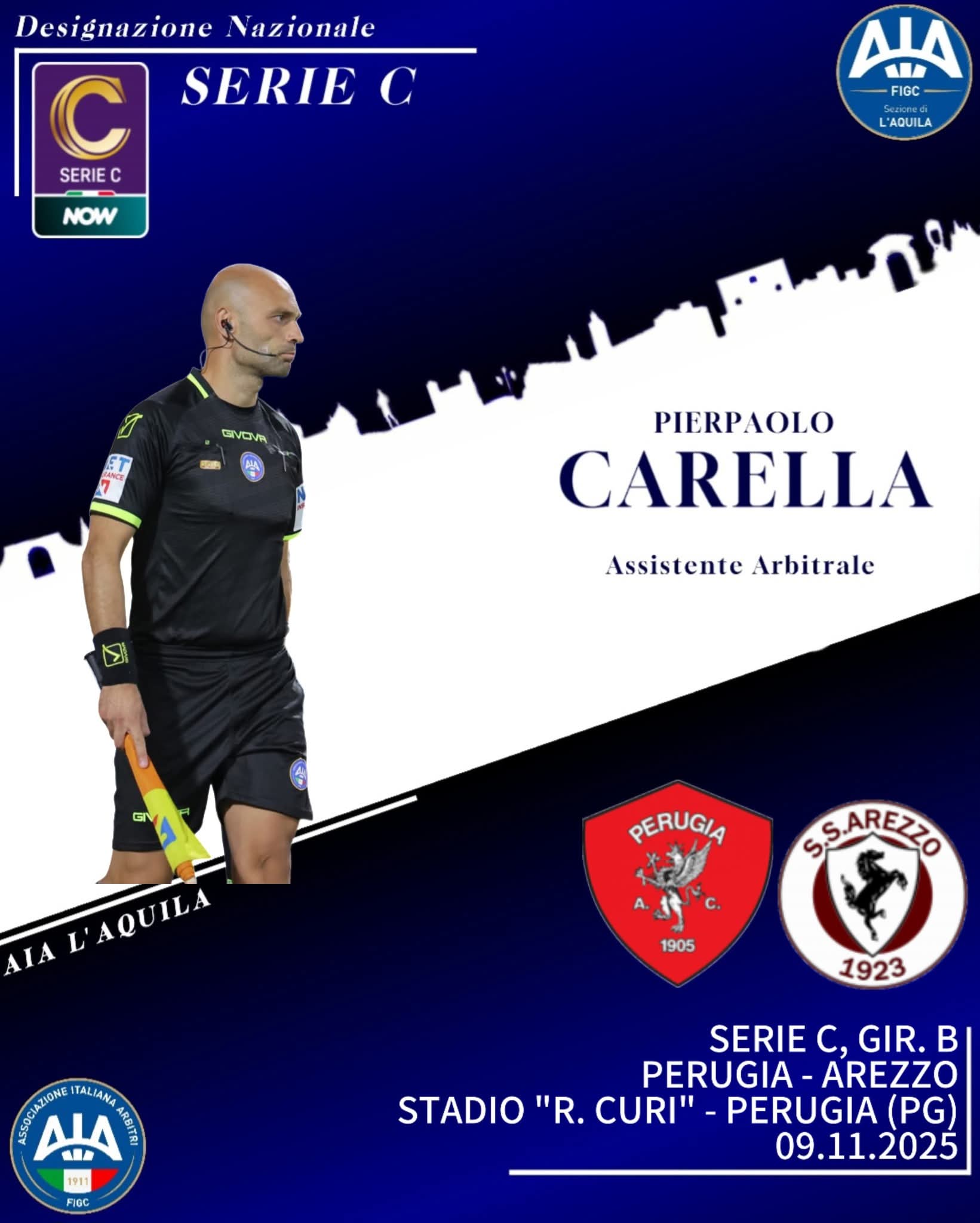 Pierpaolo Carella (AIA L’Aquila) designato come assistente per l’incontro fra Perugia e Arezzo, E’ nel programma della prossima giornata del girone B della serie C. Si disputerà allo stadio Curi, con calcio d’inizio alle 14,30.