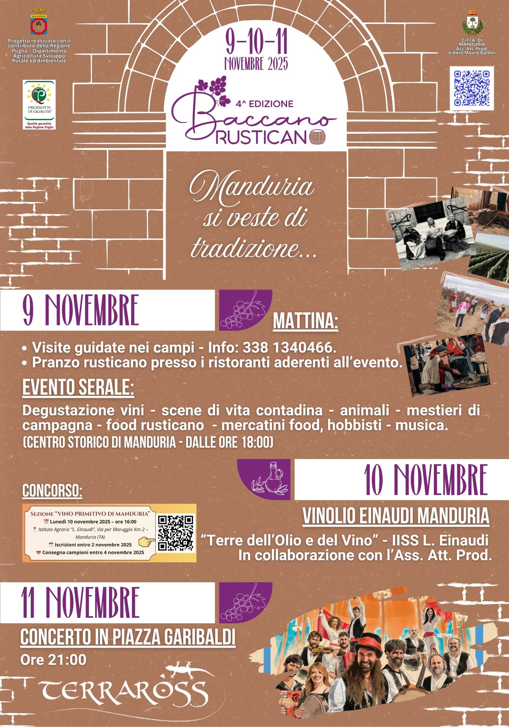 Visite guidate nei vigneti, degustazioni di vini primitivi, scene di vita contadina, mercatini con musica dal vivo, accompagneranno le prime due serate. Il gran finale, l’11 novembre, con la Festa di San Martino ed il concerto dei Terraross che offriranno un panorama della musica popolare pugliese.