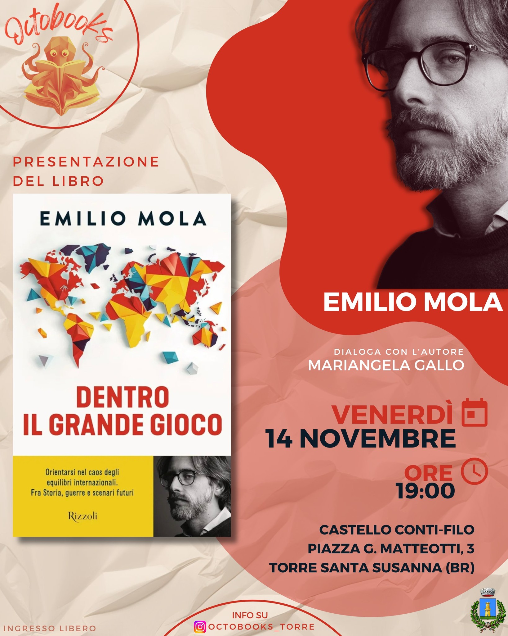 Venerdì 14 novembre, alle ore 19, presso il castello Conti-Filo (piazza G.Matteotti, 3), il gruppo di lettura Octobooks ospita il giornalista, podcaster e autore Emilio Mola per la presentazione del suo ultimo libro “Dentro il grande gioco” (Rizzoli, 2025).