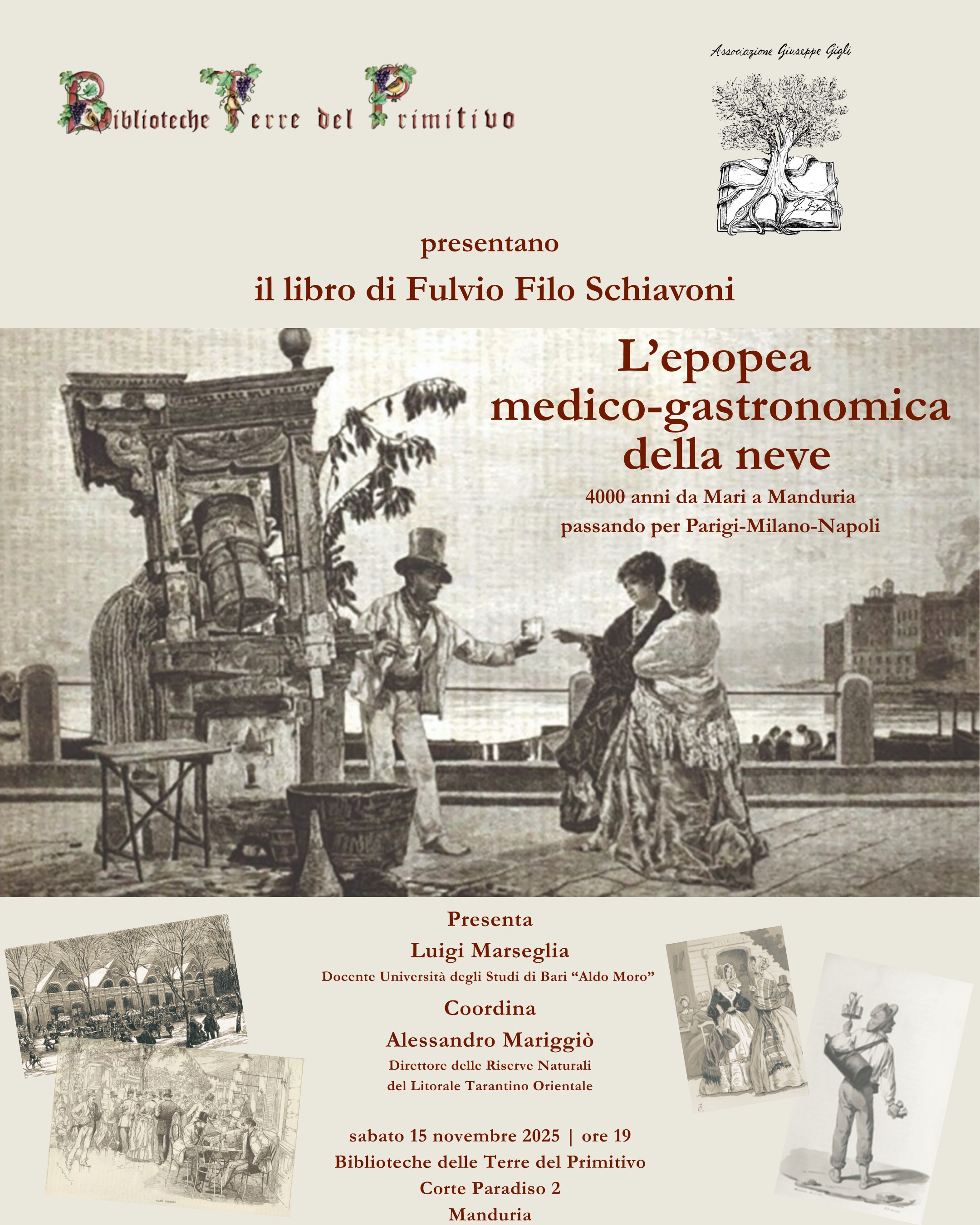 Sarà presentato questa sera, alle 19, presso le Biblioteche Terre del Primitivo (corte Paradiso 2), a Manduria, il libro “L’epopea medico-gastronomica della neve – 4000 anni da Mari a Manduria passando per Parigi-Milano-Napoli” di Fulvio Filo Schiavoni.