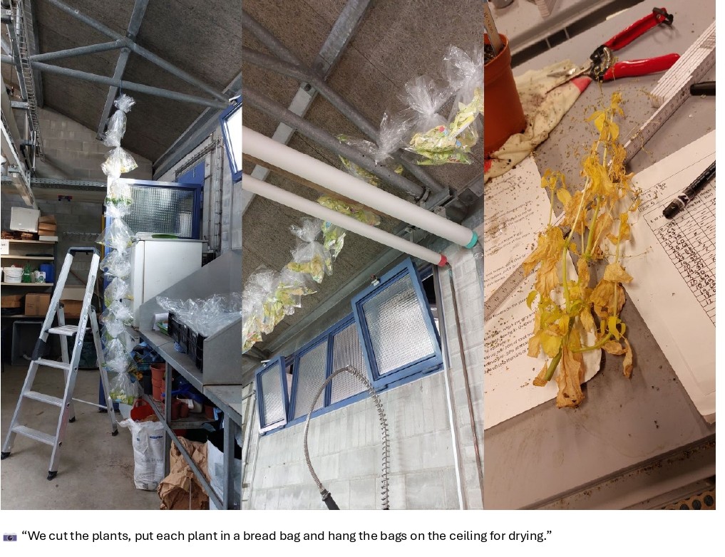 Dopo la misurazione dei parametri, le piante sono state tagliate, inserite in sacchetti trasparenti e appese al soffitto per l’essiccazione.