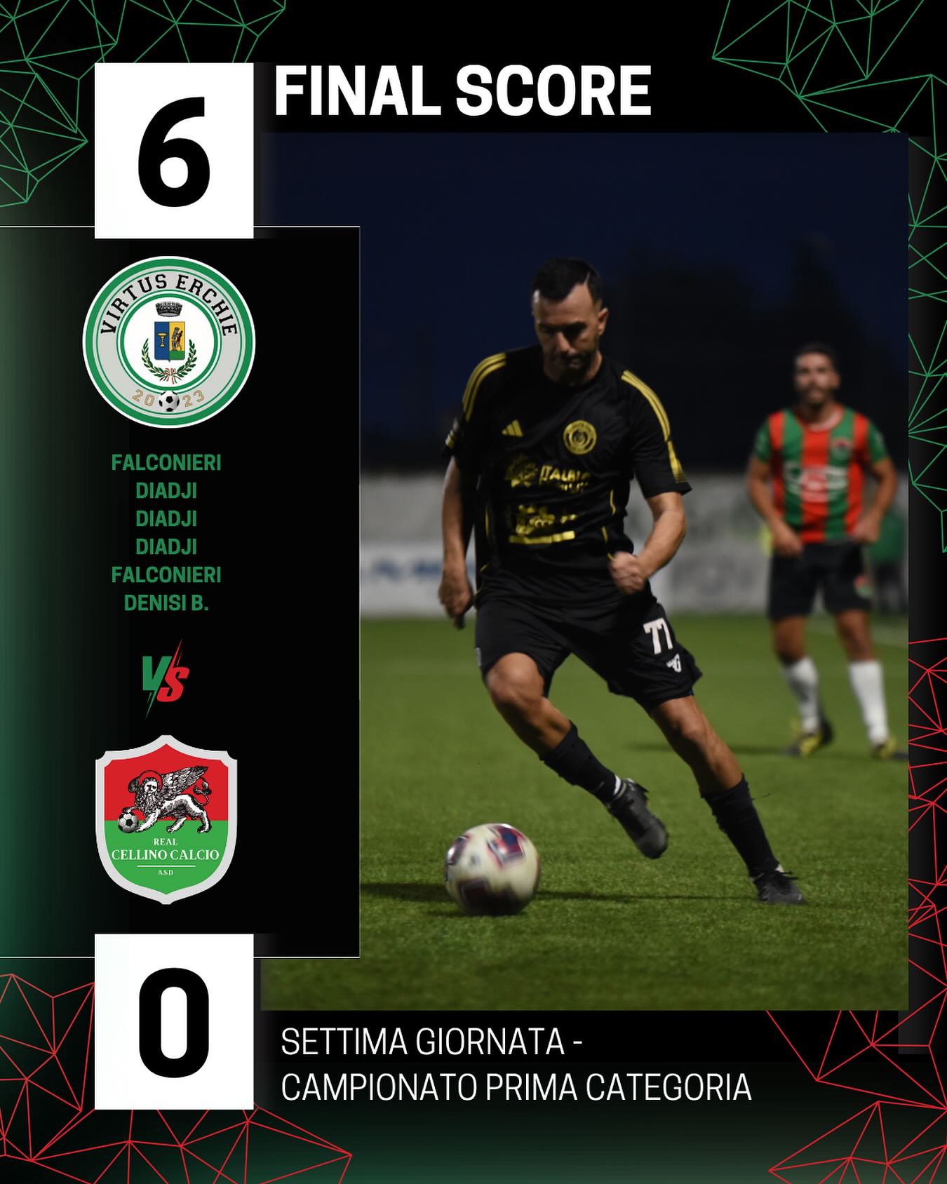 Quinta vittoria consecutiva per la Virtus Erchie, che ieri ha travolto il Real Cellino: 6-0 il risultato finale, che, nonostante l’ampio divario, non testimonia compiutamente la schiacciante superiorità della squadra allenata da mister Morleo.