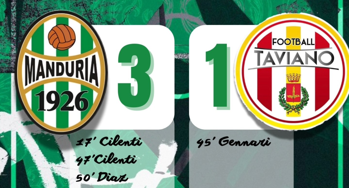 MANDURIA - Prestazione maiuscola del Manduria che, con 3 reti e una traversa, si aggiudica meritatamente i tre punti: doppietta di Cilenti, un goal di Diaz e una traversa di Prinari. Questo in sintesi il contenuto di una partita giocata per tutti i 90 minuti a ritmi sostenuti.